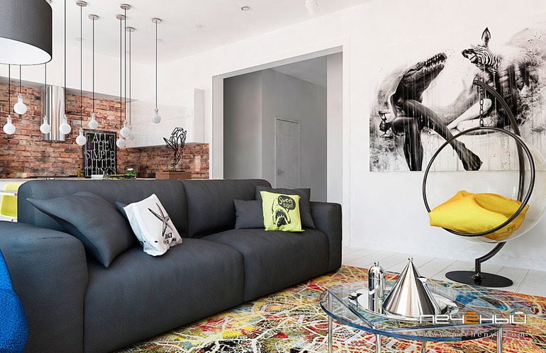 Благодаря увеличенному дверному проёму получился open space - из коридора практически сразу попадаешь в гостиную. Опять-таки, очень лофтовый элемент - большие площади, широкие проёмы... Броский монохромный принт на стене - яркий образчик современного искусства, хоть и на любителя, но сюда вписался как родной. :)