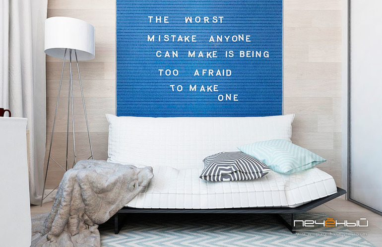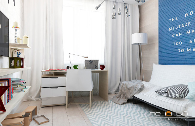 А вот и обещанный контраст: комнатка, предназначение которой - отдых и уединение. Хотел показать, что в рамках одного проекта разные комнаты могут сильно отличаться по настроению. Тут мало места, поэтому мы использовали светлые и холодные цвета, чтобы визуально расширить пространство. По этой же причине одна стена покрыта тем же ламинатом, что и на полу. Впрочем, полностью "ламинатной" делать стену не стоит, а вот если разбавить каким-нибудь панно - получится хорошо.