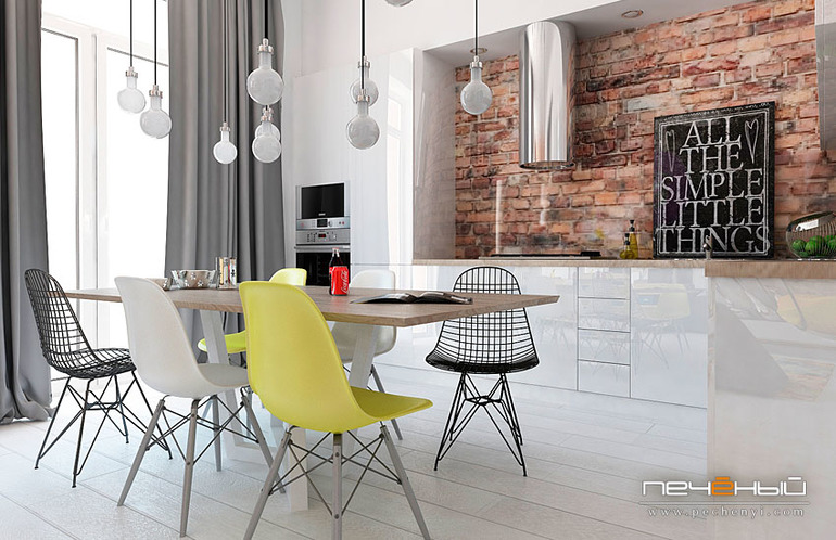Я много слышал противоречивых мнений о том, как надоел "этот ваш кирпич", но у заказчиков он пользуется популярностью, да и что греха таить - нам нравится не меньше. Гостиная-кухня получилась ровно такой, как хотелось заказчикам - в меру дерзкой, в меру смелой и уж точно неординарной. :)