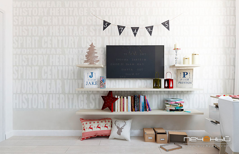 Здесь хочется сказать о буквах и надписях в интерьере: их не мало на данном участке, но в целом картинка гармонична, потому что соблюдены размерно-цветовые пропорции. Маленький совет: постарайтесь, чтобы некоторые буквы по цвету совпадали с другими элементами в комнате, поддерживали их.