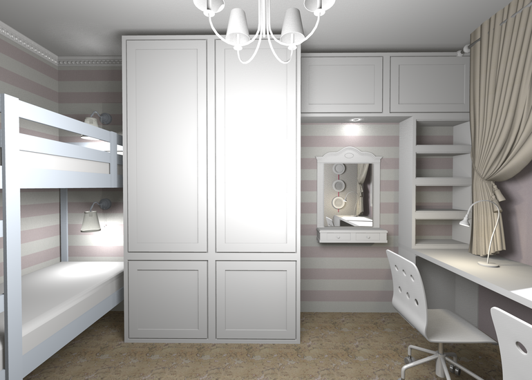 Не нравится практически вся стена со шкафом. Для начала, сам шкаф заслоняет приток воздуха к предполагаемой подушке (а спать головой к двери — не всем нравится), для второго яруса это важно. Дальше идет вообще непонятный кусок... зеркало это с ящиком — для детей намного старше, кмк, для подростков уже. И под него ничего не поставить, типа кукольного домика, иначе головой треснутся. Если принципиально зеркало, как раз есть место у двери, где стоит скелет платья )) туда можно даже узкое зеркало, но в полный рост — актуальнее. Низкая белая тумба, имхо, будет завалена барахлом сверху всегда. И действительно, дети еще очень! маленькие, а комната в целом выглядит подростковой.
