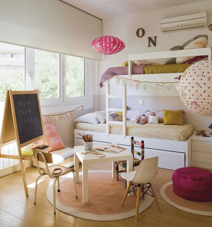 Рабочее место в данном случае - это скорее место для творчества, поэтому всё его окружение должно стимулировать креативную деятельность ребенка. Задействуйте стены и пространство по соседству: здесь можно развесить интересные рисунки, доску для заметок или сделать меловую стену.
