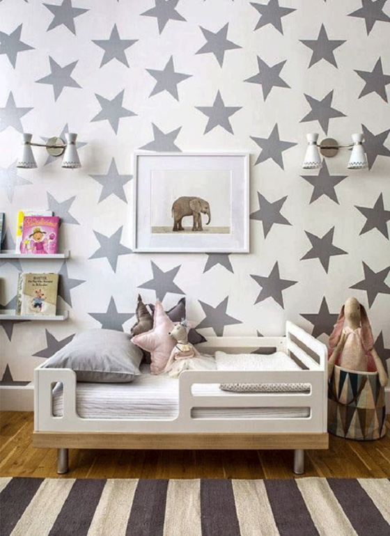 Лучшим решением будет нейтральный фон (пожалуйста, откажитесь от «голубого для мальчиков, розового для девочек»), который будет способствовать развитию фантазии и воображения ребенка, дополнить его поделками, картинками, книгами, а также текстилем любимого цвета и веселого рисунка. Можно использовать гирлянды, разноцветные флажки, наклейки на стены (это проверка и для Вашей фантазии тоже!).