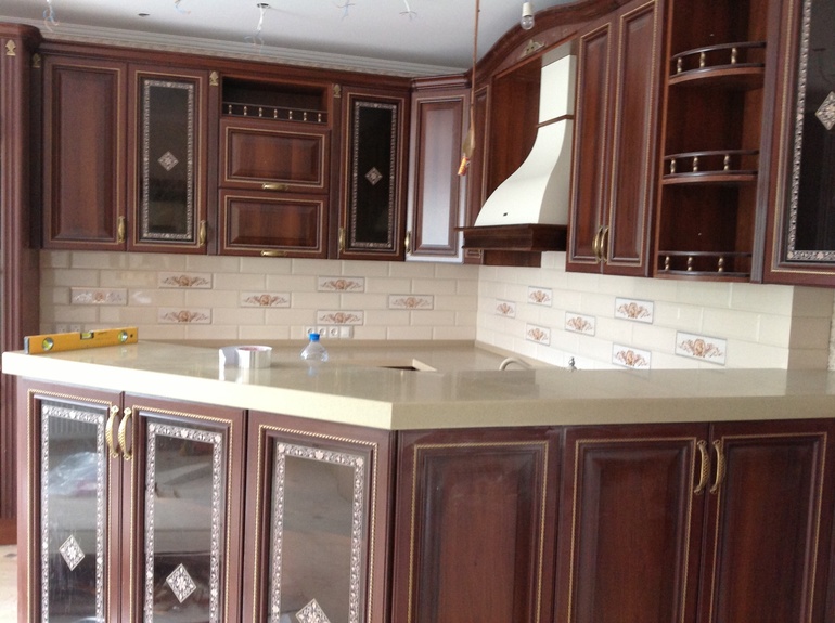 Почему в уходе не проста? Я тоже думаю над этим- плитка выпуклая, тяжело ее будет мыть и соединение со столешницей... Неровное будет из за выпуклотости