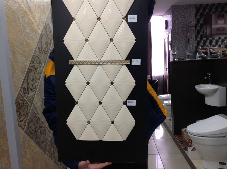 конечно ромбики, себе недавно такие сделала, только у меня темные и без кругляшков, в уходе не проста..я бы сделала фартук одним полотном (в цвет пола, рисунок мрамор)
