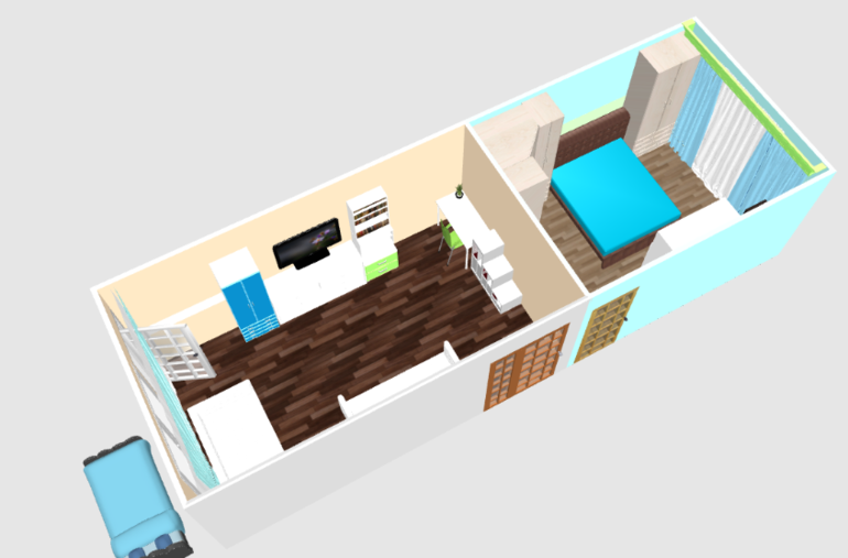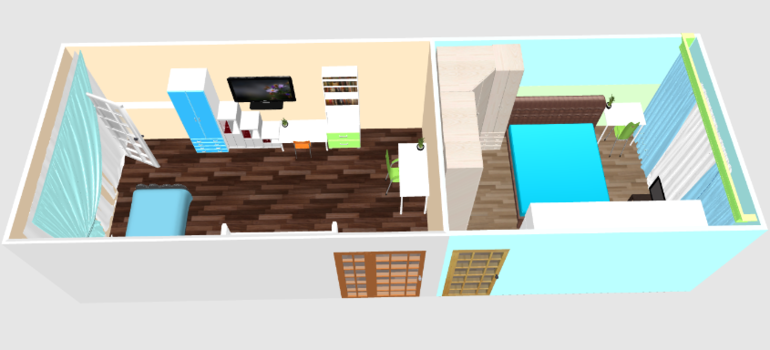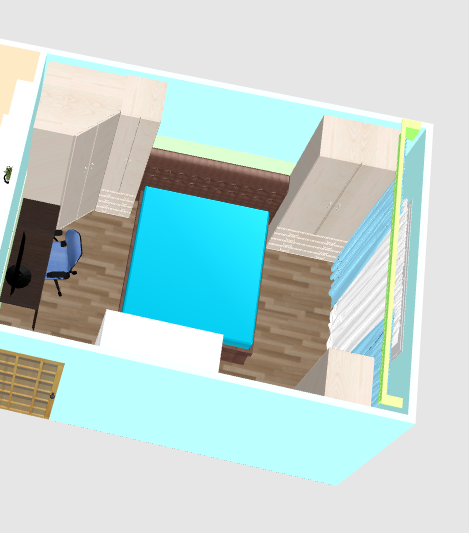 В спальне не знаю как все впихнуть, чтобы уместилось и пройти можно было))