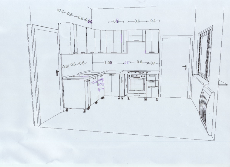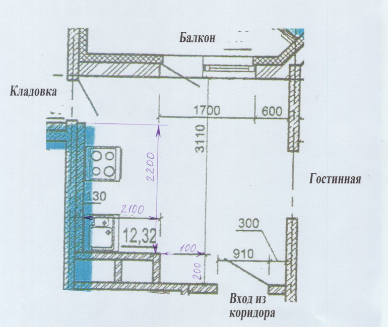 Интерьерное решение кухниЗдравствуйте. Помогите пожалуйста с расстановкой на кухне. Кухня сложная, на каждой стене дверной проем (вход на кухню из коридора, дверь в кладовку, проем в гостиную и еще до кучи балконная дверь). Площадь кухни по плану 12кв. метров, но когда мы с мужем увидели ее так сказать в живую, кухня показалась маленькой. Хотя сейчас у нас кухня всего 6,6 кв. метров, я думала, что эта кухня покажется нам большой. Примерно расстановку мебели под кат. Хочется рабочую поверхность побольше. Всю голову сломала
