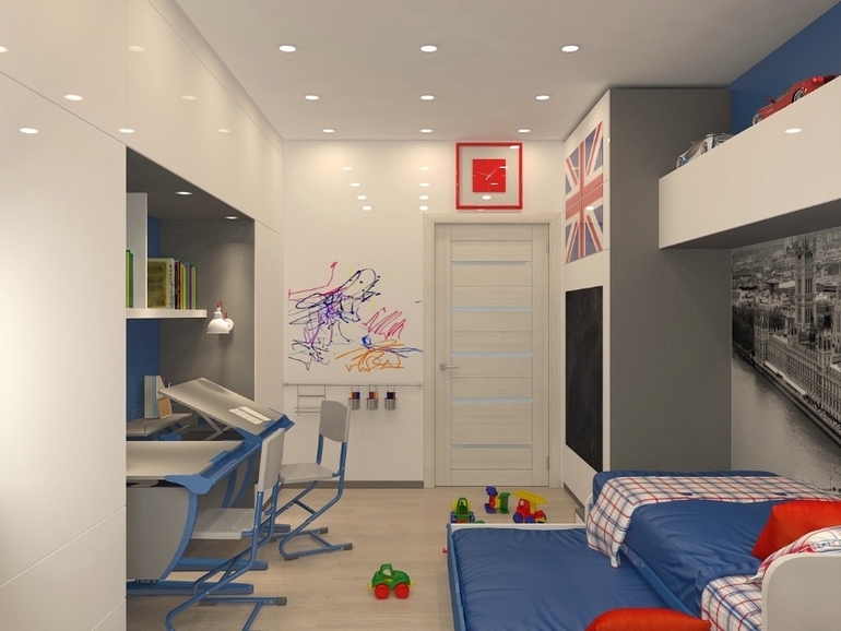 кровать выдвижная, около двери магнитно-маркерная стена, по бокам от парт шкафы для одежды, около кровати шкаф для игрушек, на дверце шкафа запланирована школьная доска для мелков