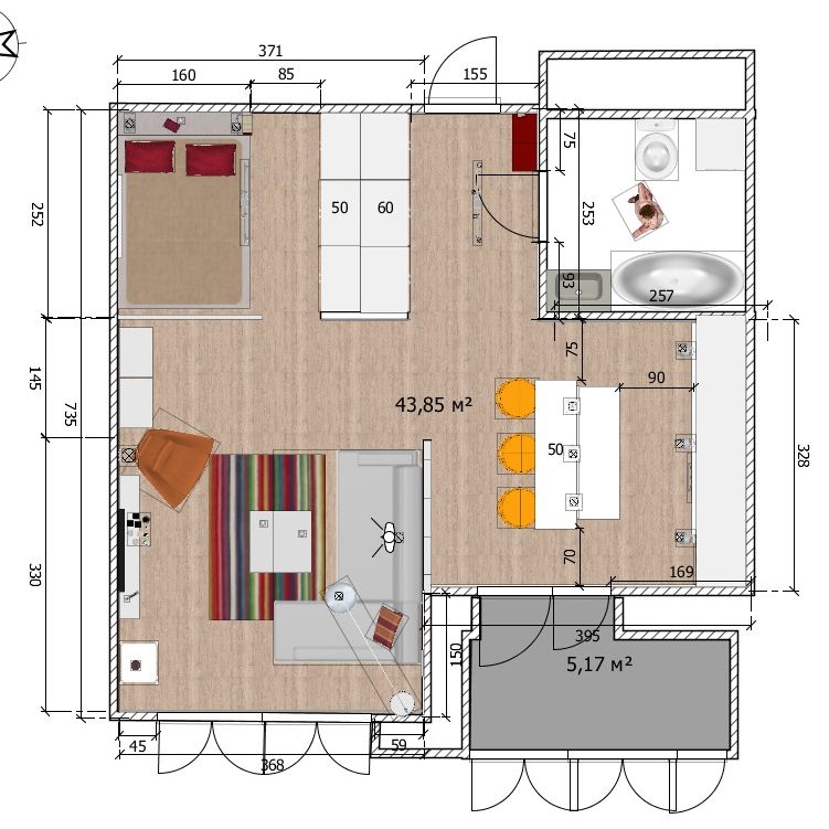 Лена! Спасибо большое! Сама планировка мне очень нравится. Перегородка между спальной зоной и комнатой удалась, это лучшее решение, тем те над которыми мы думали ранее. Я только думаю может все-таки в комнате сделать верхний свет? и на кухне подумаю сделать барную стойку или стол. Зановесочки пожет какие-то повешу, окна хоть и на лес, но как-то мне кажется уютнее будет. Но это я думаю уже в процессе буду решать. Сами идеи зонирования пространства и расстановки мебели мне нравятся. Единственно не поняла вторую картинку, вроде это прихожая и за стеной (шкафом) должна быть спальная зона, а там как-то гостиная просматривается.