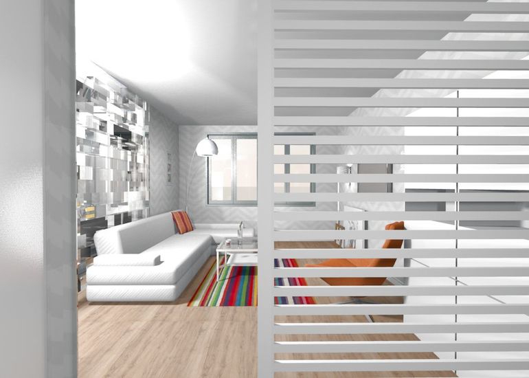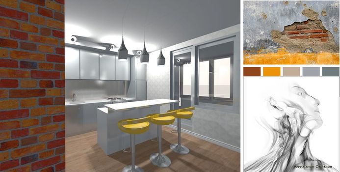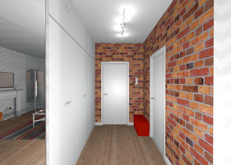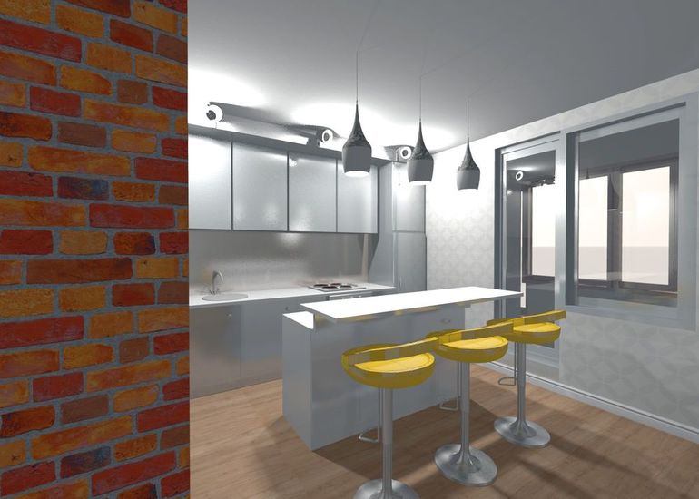 Ой Елен кирпичики :))) я в дипломе лофт делаю с такими:)))))В принципе все окей! Только на визе плинтусов и карнизов не хватает. Убрала бы шкаф из спальни и перегородку вперед чтобы разместить кровать с 2 подходами, а шкафы можно по бокам от кровати разместить.И "стерильность" от освещения — его же можно в свитхоме переставить на теплый желтый.