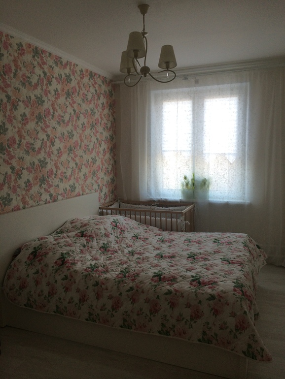 Я бы покрывало поменяла, перебор с цветами, на мой взгляд, выбрала бы что-то однотонное, не цветочное, сочетала бы со шторками. На стену что-то в белой рамке, но и без ничего хорошо)