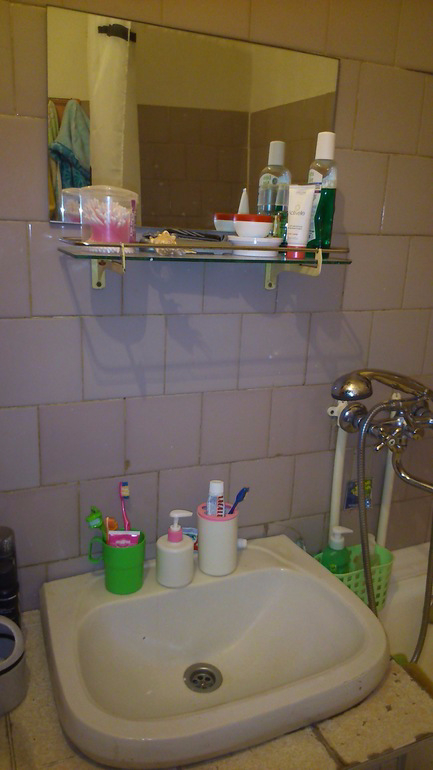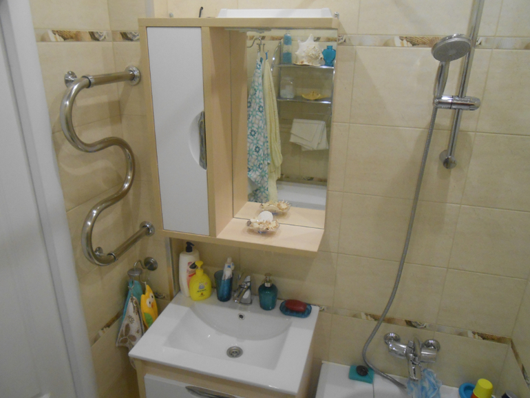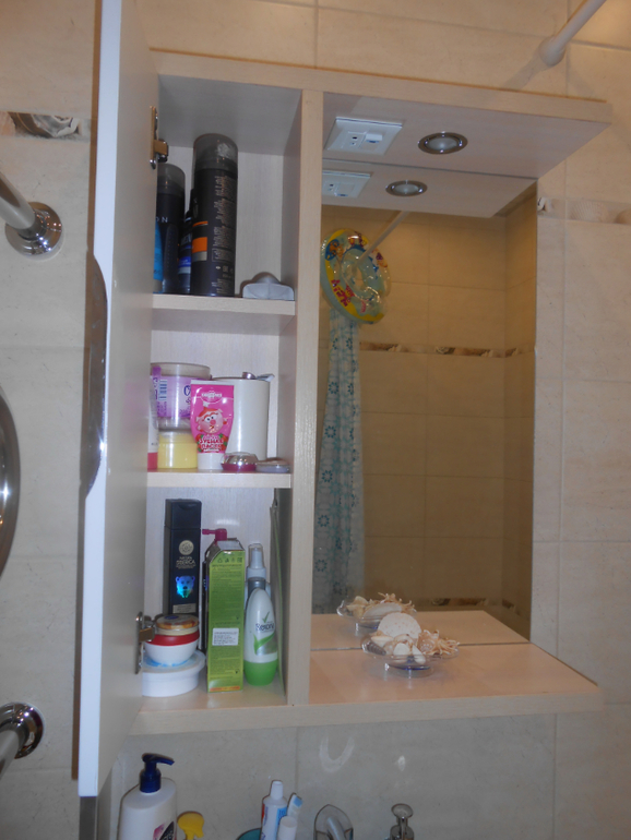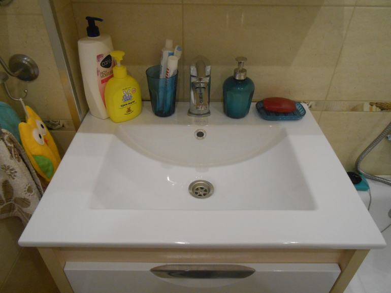 С поверхностей постаралась по максимуму всё распихать в шкафы, чтоб ничего не валялось и не стояли бесконечные баночки и бутылочки. Только мужу разрешила в ближайшем доступе оставить шампунь :))) Ну и мыло детское не особо вписывается, но очень нужно т.к. с малышом теперь постоянно ходим подмываться.
