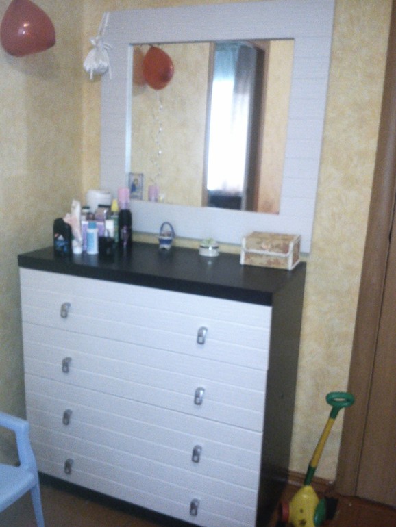 Комод и зеркало на фото Гретта от столплит. У меня из этой серии угловой шкаф и шкаф-витрина+ диван бело черный. И обои под стать. Мне нравится. Но у нас спальня-зал.
