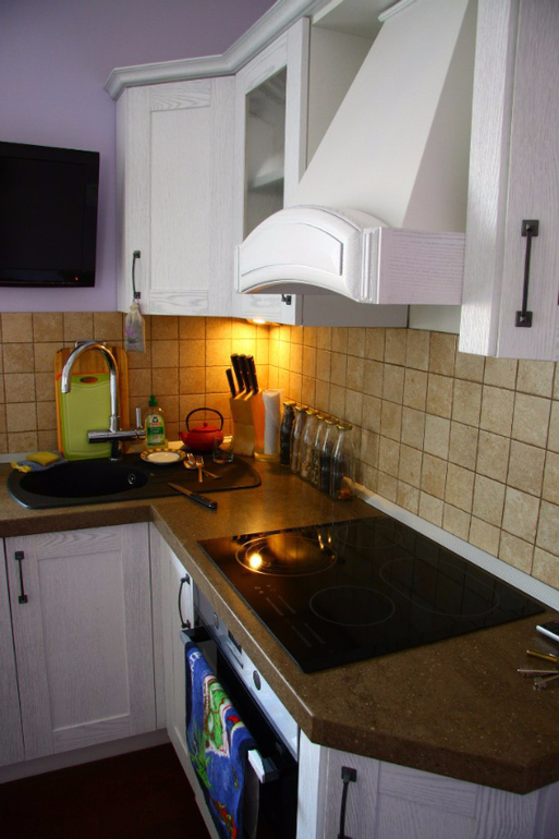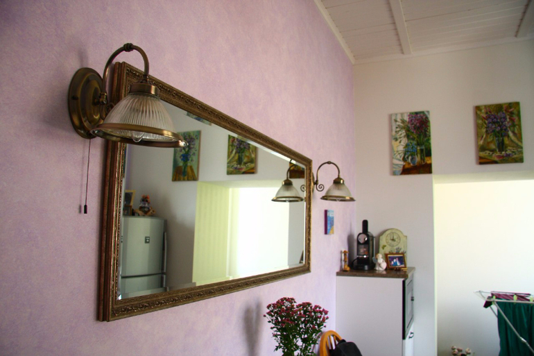 Из однокомнатной квартиры, была сделана двухкомнатная, при этом осталось, много пространства и света. Квартира выполнена в среднем стиле между провансом и гранжем. Использовано пять видов декоративной штукатурки и много дизайнерских аксессуаров, сделанных автором.