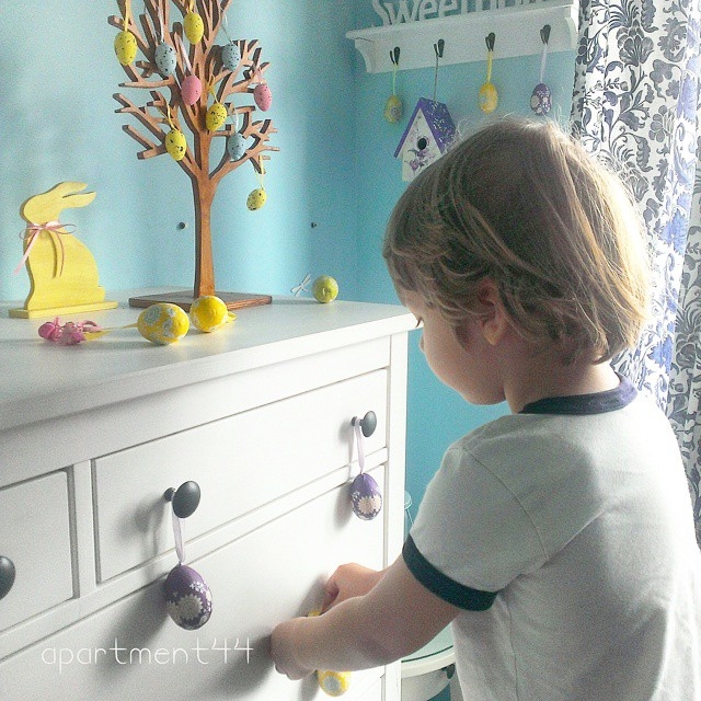 Каждый год мы обязательно наряжаем пасхальное деревце с детьми. И вообще, дети с удовольствием возятся со всем этим декором. Мы его постоянно видоизменяем и переставляем туда сюда:)