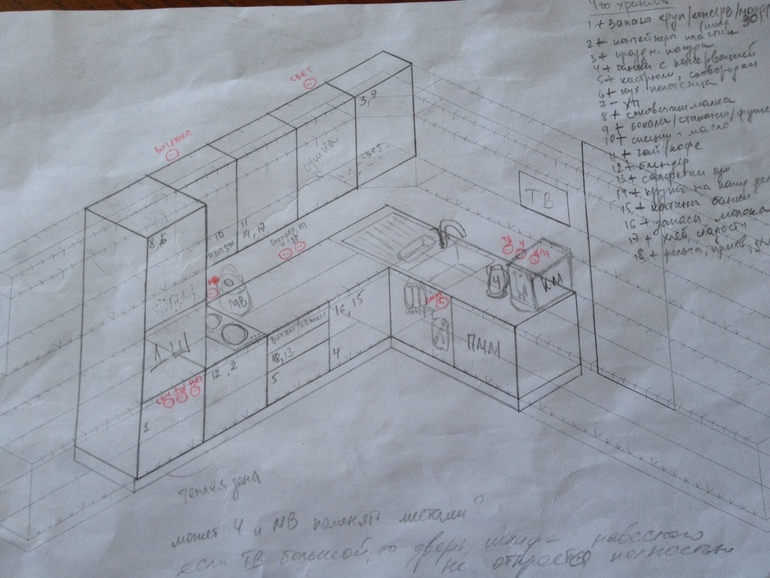 Собственно вопрос. Стена над мойкой - пустая, планируется повесить туда небольшой телевизор (30 на 45см), где-то над посудомойкой. Хочется пространства, с одной стороны. С другой стороны, не будет ли пусто слишком? Может сделать там пару полок открытых, отступив от шкафа навесного в углу, чтобы он открывался свободно? И ТВ на полку поставить? Эта мысль появилась после увиденной кухни здесь Наташки-ромашки: