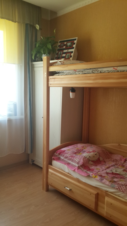 Итак дано- комната 17 кв. м - 3,5 в ширину и 4 м в длину. Дверь посередине, большое окно. Ремонт достался от прошлых хозяев, ему 4 года. И вот, наша лялька подросла, пришло время делать комнату для двоих детей - 8,5 лет - мальчик и 2,2 года - девочка. Старая громоздкая мебель была продана. Вдоль стены справа встала двухъярусная кровать из сосны и 2 икеевских шкафчика для одежды (встали тютелька в тютельку),![]()