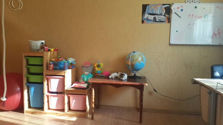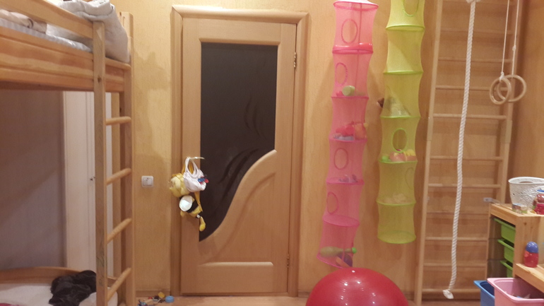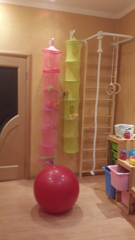 за дверью слева располагается игровая зона с системой под игрушки труфаст, и спортивным уголком, к сожалению уголок не встал сразу за дверью, чтобы освободить угол для труфаст (там тонкая стенка для крепления),![]()