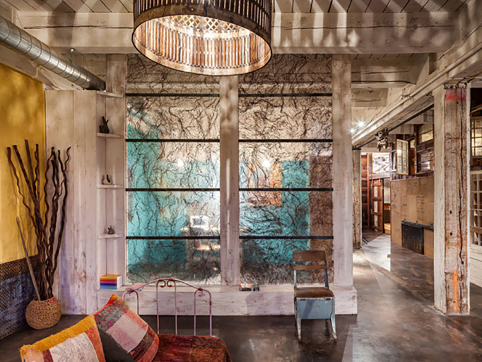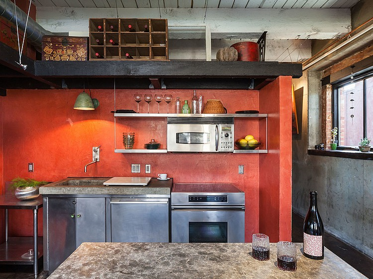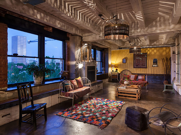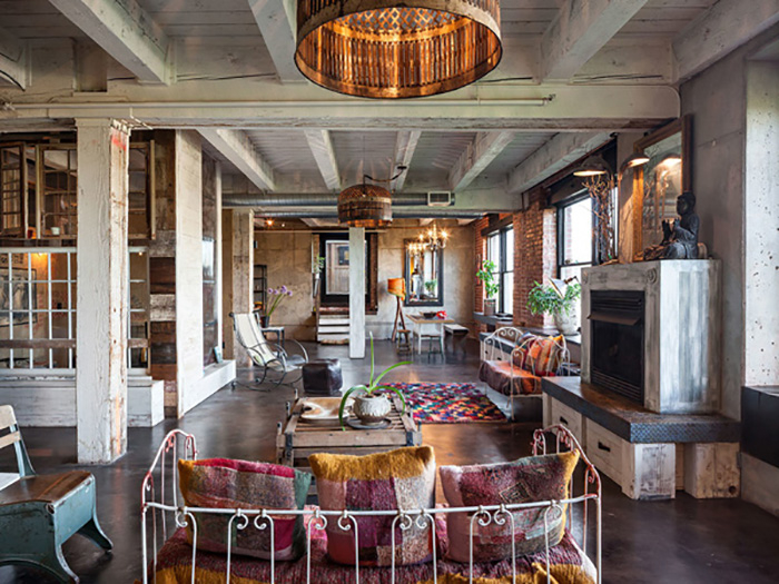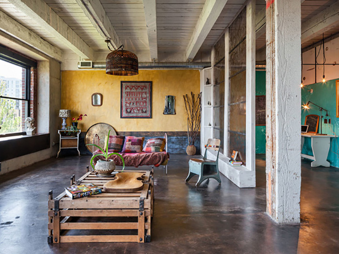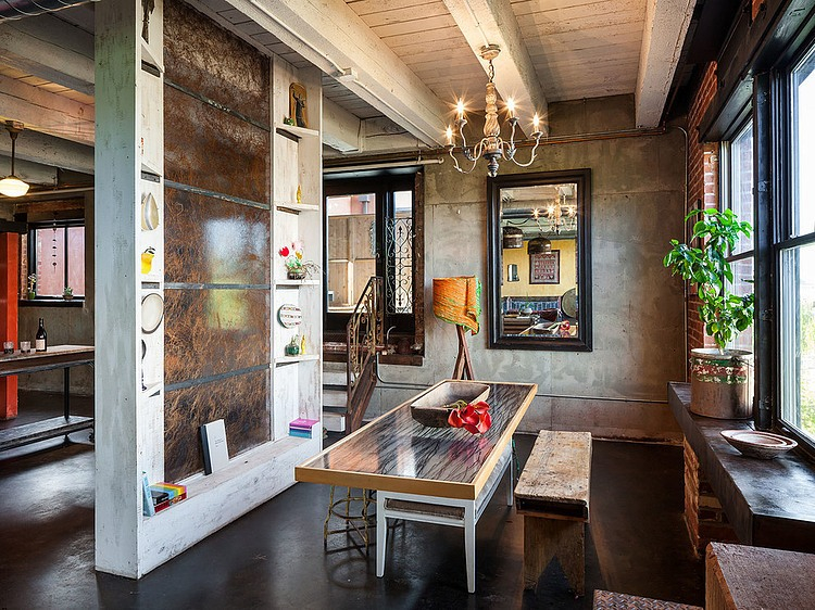 В итоге в лофте смешалось все, что только можно вообразить: потолки и индустриальные стены, краска и красная венецианская штукатурка, мешковина вместо обоев в гостиной, стол ручной работы, окна из старого сарая, марокканская лампа, японская традиционная ванна из кедра - уф, всего и не перечислить! Это эклектичное сумасшествие можно рассматривать часами: гадать, из какого выполнено то или иное дизайнерское решение, как здесь оказался каждый из предметов, а главное - как же так получается, что при этом пространство выглядит так гармонично?