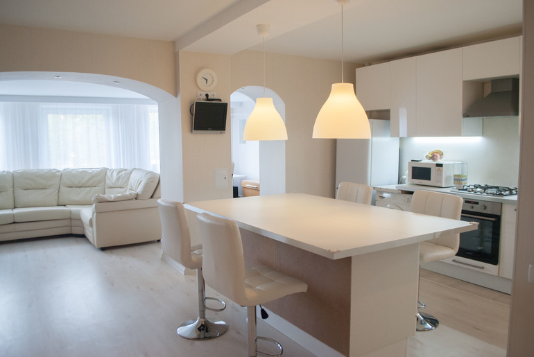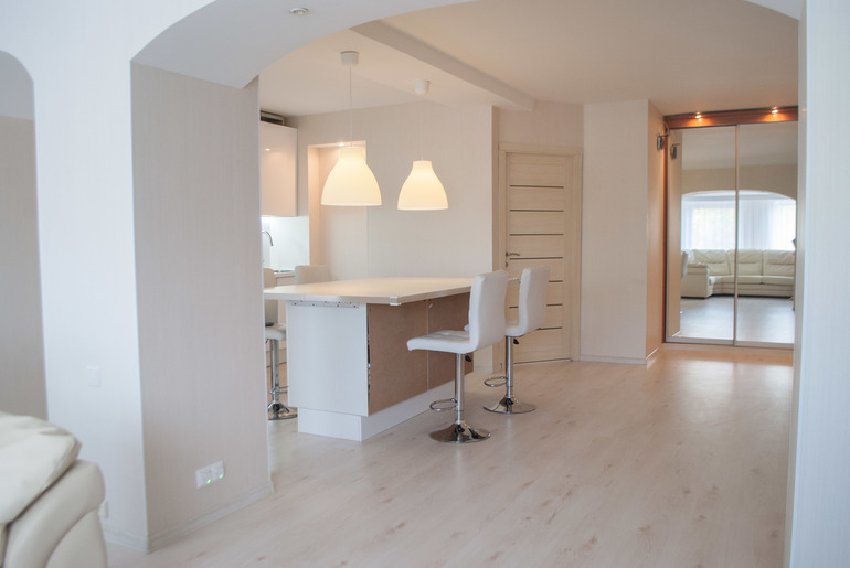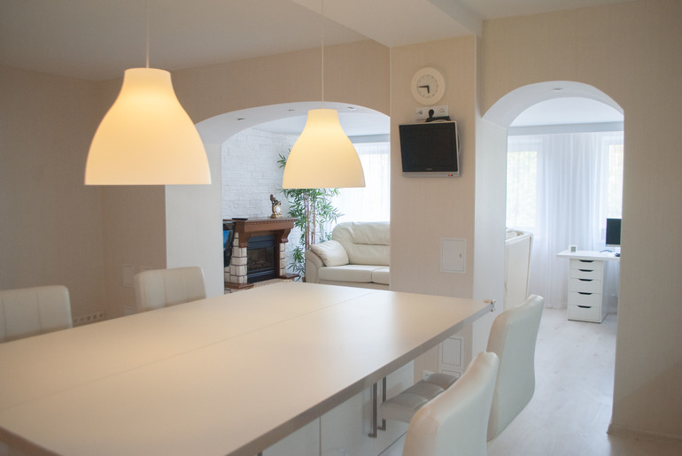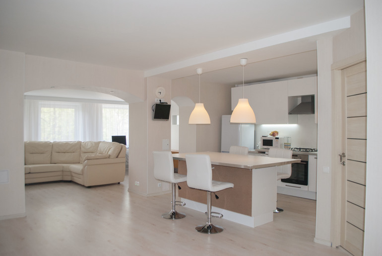 Основной переделке подверглись гостиная, кухня, пристройка к гостиной и ванная комната.