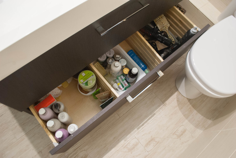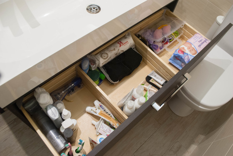 Очень вместительная тумба, которая позволяет хранить все многочисленные баночки-тюбики внутри, но в то же время под рукой. Благодаря ей, уборка в ванной существенно сократилась по времени)