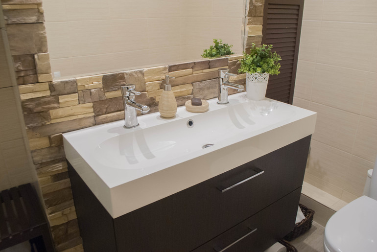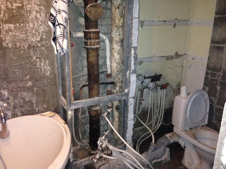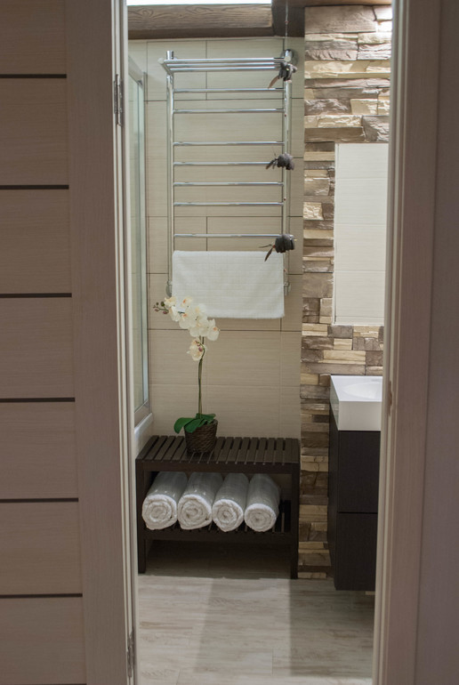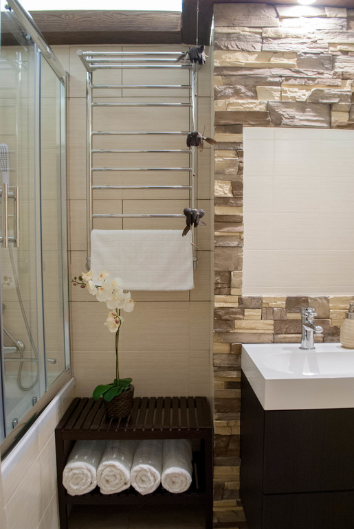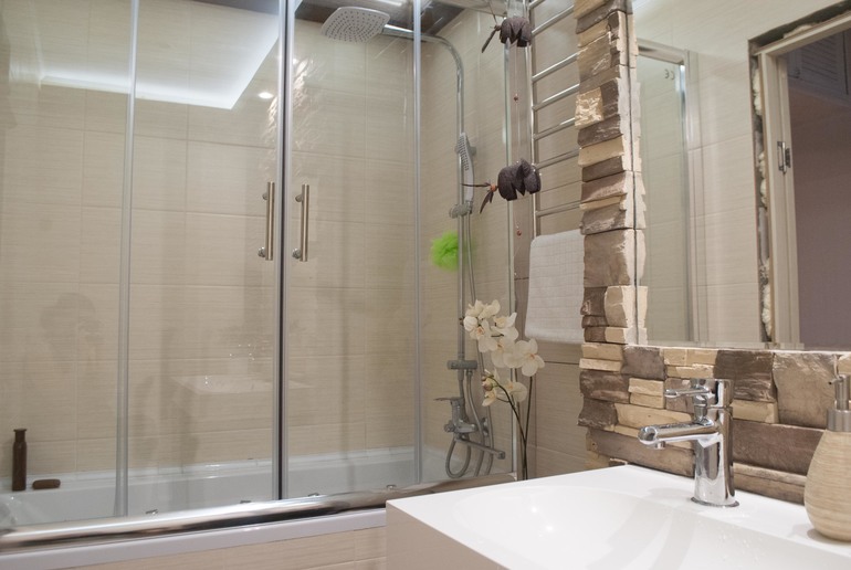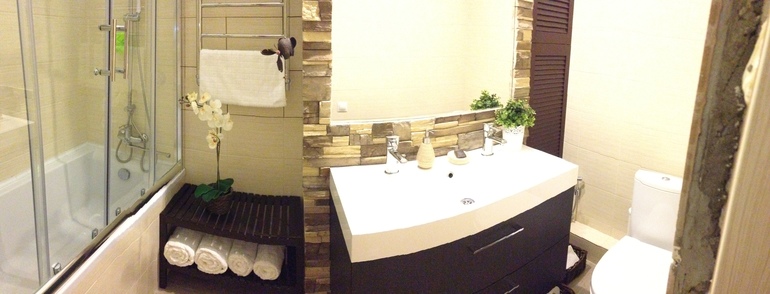 Также мы кардинально переделали ванную комнату, она была обычной, маленькой, разделенной стеной с санузлом. Стену мы сломали, унитаз перенесли...