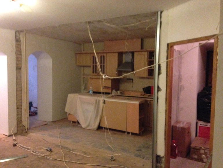 Это вид на уже сломанную стену между кухней и гостиной, спиной к спальне, детской и ванной комнате. Справа от кухни проем в прихожую, налево - в пристройку.