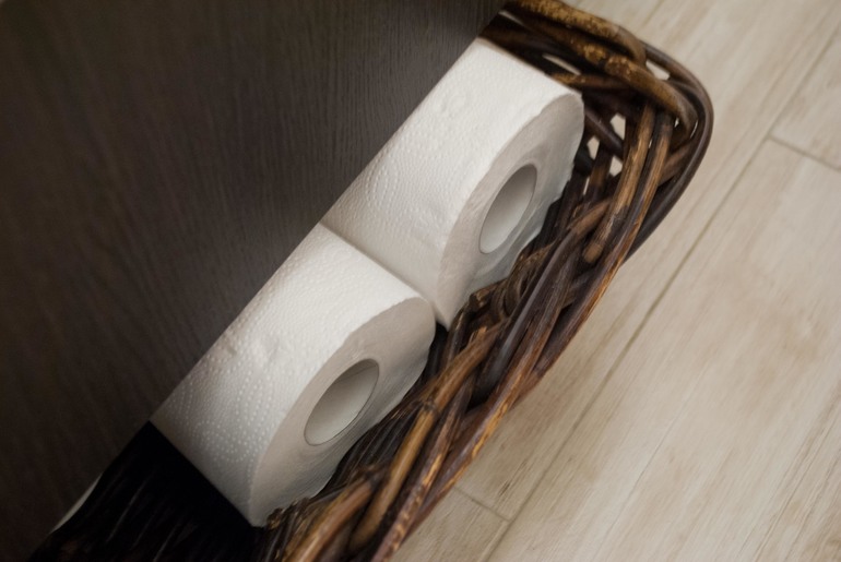 Туалетная бумага в корзинке под тумбой: