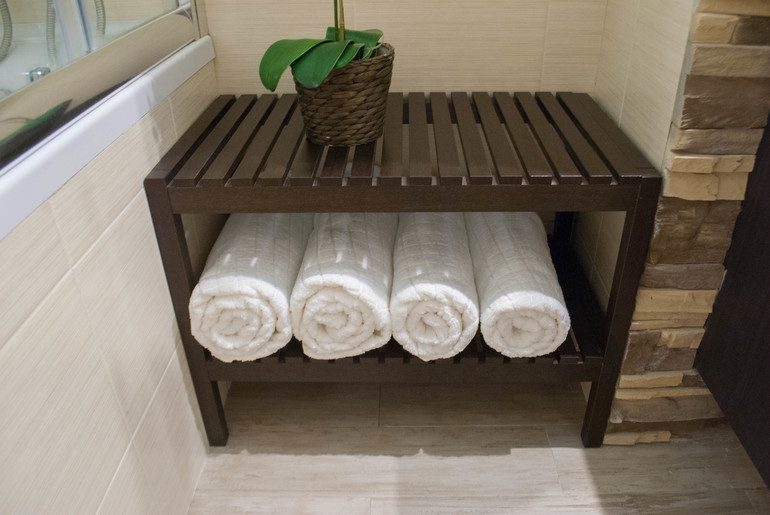 Полотенца хранятся теперь так, а не висят вокруг на вешалках, сокращая пространство: