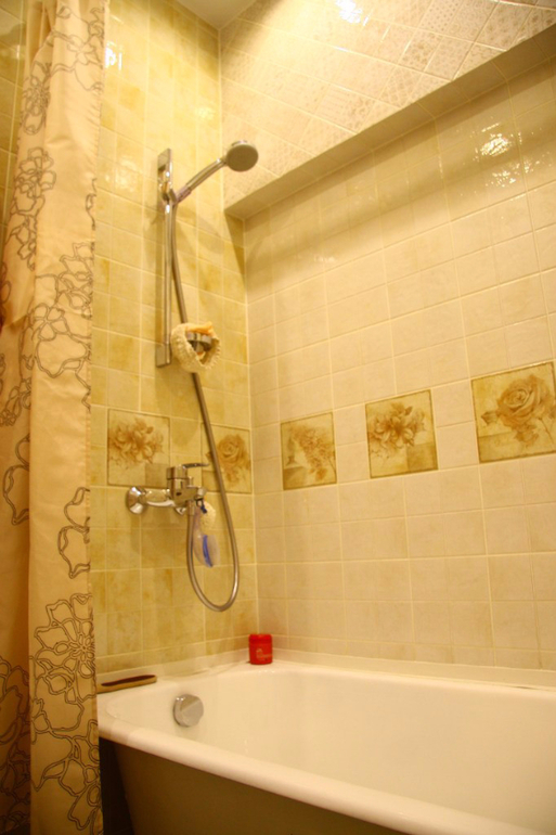 Спасибо) Коллекция одна, просто другой вид плитки, там было несколько вариантов декора и хозяйка захотела использовать все, наверху был ригель, решили не тянуть его до пола, так как места мало, с этой же целью не стали закрывать ванну экраном, а сделали декоративные ножки, саму ванную также задекорировали, использовав декор с верхней плитки. По поводу кнопки, согласна, но плитка 20 на 20, разделана визуально еще на 4 и нужно было хоть как-то держать линию. Помню много было с ней забот, а каких именно не помню — проекту 4 года)