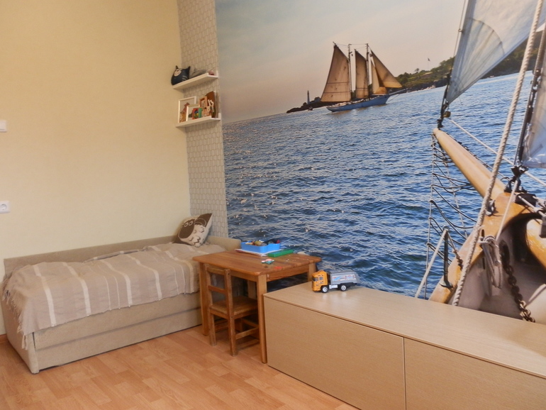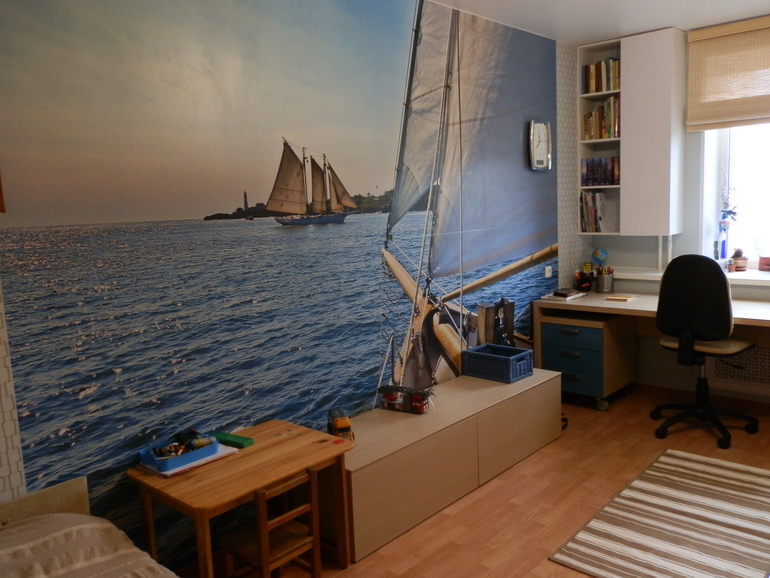 ну конечно, хочется же ,чтобы красиво было:)раз у вас морская тематика, можно будет на стену справа от окна (над кроватью) повесить корабль или канаты или штурвал.