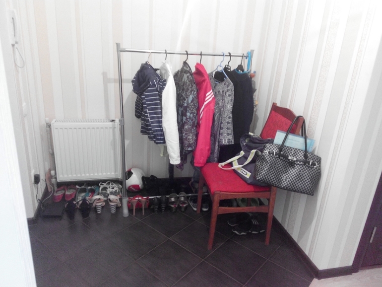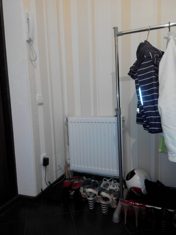 В идеале я бы хотела по стене 180 см шкаф, полностью закрытый, зеркальный. Но эта батарея. Если делать часть открытой, то как ? совсем не хотелось бы крючки для одежды (