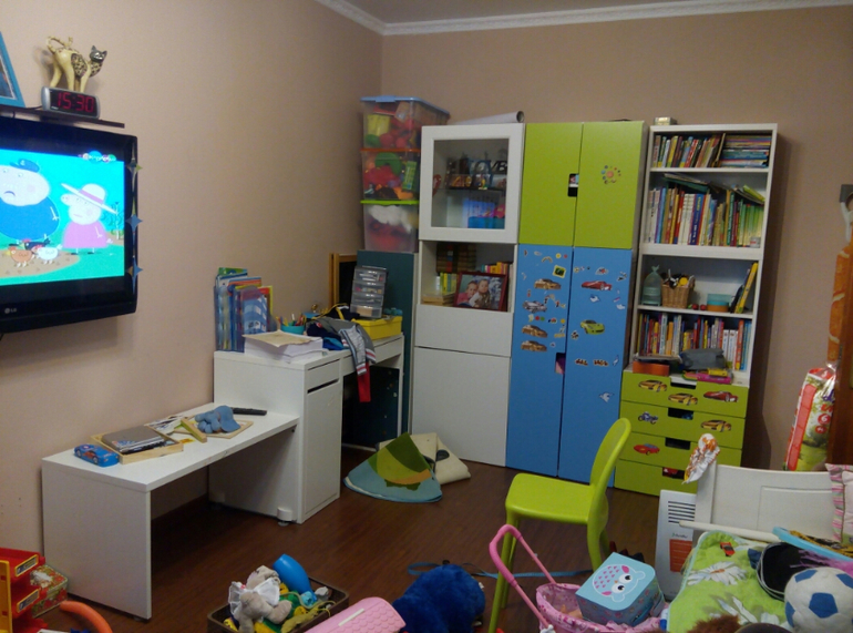 хранить телик пока они вырастут уж точно негде=) да и сын смотрит мультики. Игрушки просто вывалены, мы мебель двтгали а дети играли