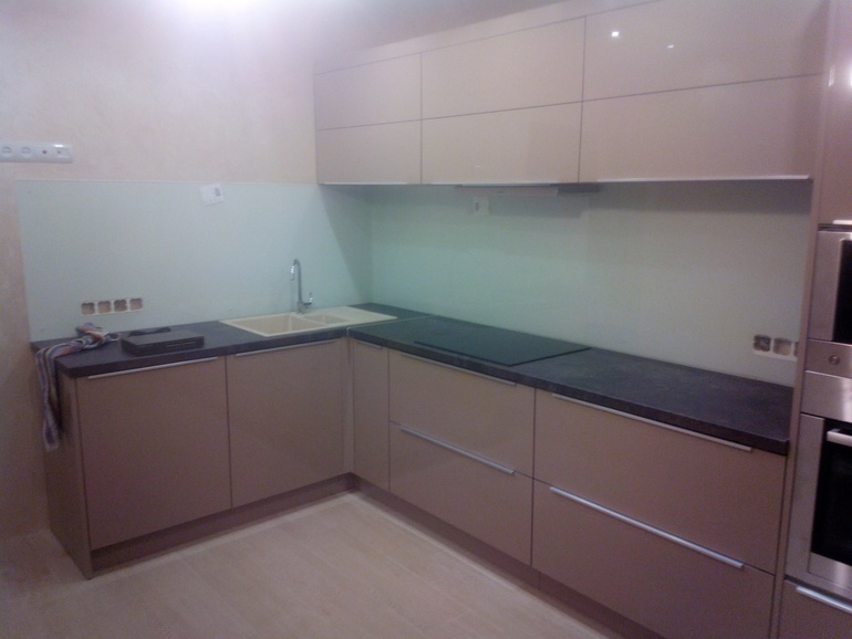 Установщики нам предложили за небольшую доплату сделать прозрачное стекло, чтобы белый крашеный фартук через него просвечивался. Какой результат в итоге получится, мы не знаем. Стоит ли переплачивать?