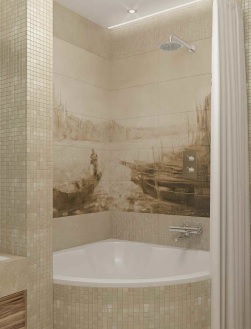 Интерьерное решение ванной комнатыРешили с мужем, что просто однотонная плитка за ванной скучновато и дизайнер нам подобрала вот такие панно. Красиво и гармонично, на мой взгляд, панно вписалось в дизайн комнаты.