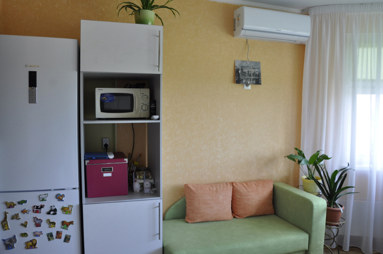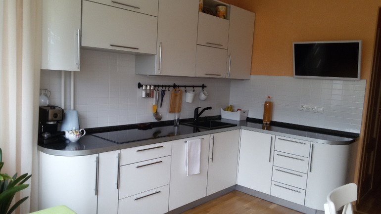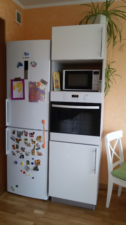 Кухню свою обожаю. Проводим тут 90% времени днем. Конечно я бы сейчас кое-что переделала. Не совсем нравится комплектация кухонного гарнитура. Но и лучше правда я пока не придумала. Не очень нравится колонна с духовкой. Это супер удобная вещь, но отдельно стоящая как то выбивается из картины. Хорошо бы холодильник тоже встроенный, но слишком они маленькие для нас. И раковину с плитой разнесла бы сейчас подальше. Стол и диванчик меняются местами периодически. Никак не могу решить как мне больше нравится, что скажете? Диванчик тоже выбирала исходя из места от пенала до окна, а если оставить у окна, можно было бы взять полноценный. Хот этот очень удобный, может со временем поменяем, к следующему ремонту ))). Вид из окна у нас прекрасный, поэтому так приятно пить чай и смотреть в окошко, умиротворяет.