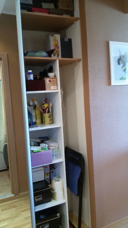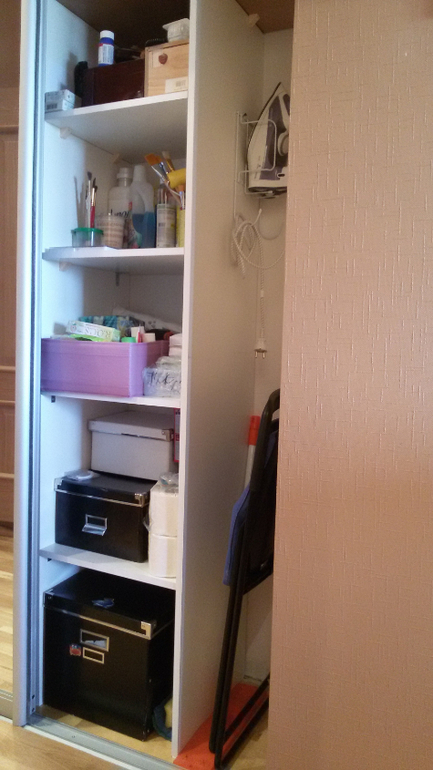 Это правая половина. Здесь полочки с хозяйственными запасами, опять моим рукоделием, место под гладильную доску, утюг, швабру. Я еще хотела б пылесос сюда спрятать, но не вместилось (((