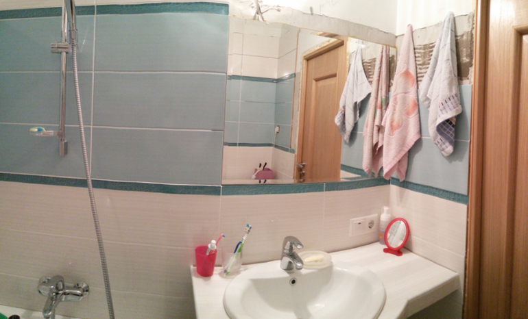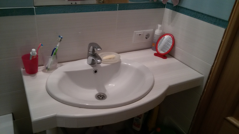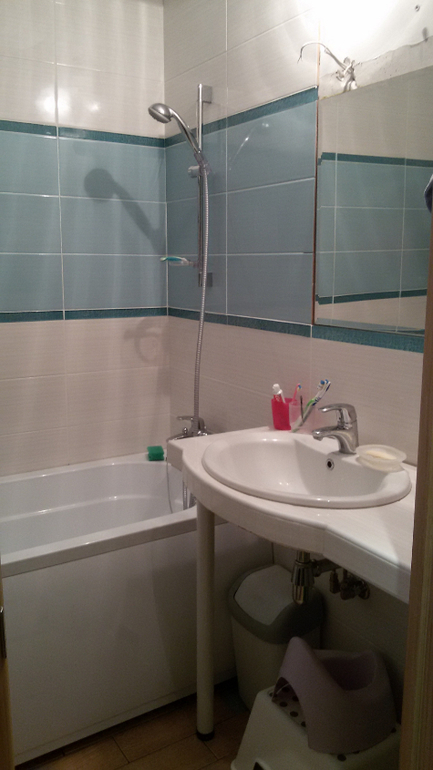 Ванная совсем сырая. Даже плитка еще не доложена. Напомню, что все работы делаем сами, только полотенцесушитель менял сантехник из ЖЭКа, т.к. стояк надо было перекрывать. Разводку воды муж уже делал сам. Столешница из гипсокартона и обложена плиткой, мечта. правда хотелось чуть другого исполнения, но тоже неплохо. Еще будут керамические уголки на стыках. И над ванной тоже, т.к. без приключений и тут не обошлось. Размер сантехкабины ровно 170см, как ширина ванны. А муж уперся и сказал, что акриловую ванну ставят на плитку. Уложил плитку, а ванна в итоге не влезла. Пришлось сбивать плитку с одной стороны. Намучились конечно, т.к. вытащить ванну уже было нельзя, она просто застряла. После всех доделок купим шкаф Икея над стиральной машиной и все спрячется в этот шкафчик.