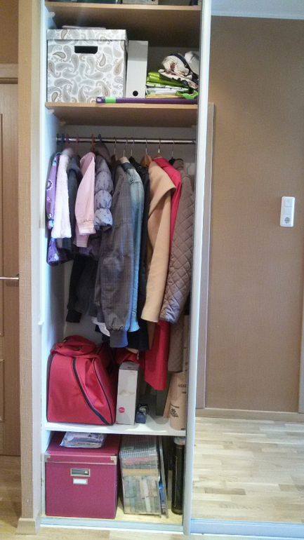Это левая половинка. Тут висит верхняя сезонная одежда, снизу мои рукоделяи, оверлок, сверху коробка с шарфами/шапками, и еще выше полка с обувными коробками и инструментами мужа. Две верхние полки проходят по всей ширине шкафа