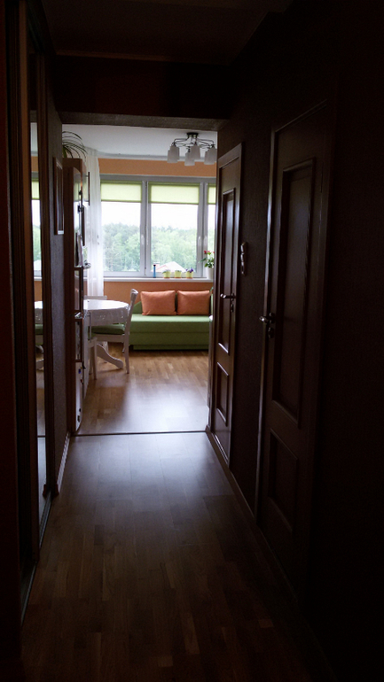 Вид на входную дверь, которую не меняли, осталась от прежних хозяев. Мебель Икея. Еще не доделан наличник над входной дверью, не хватает плинтуса одного, сразу не хватило, докупали, но так и лежит не приделанный, не покрашен еще раз потолок и не висит люстра. Делов то на пару часов )) или лет