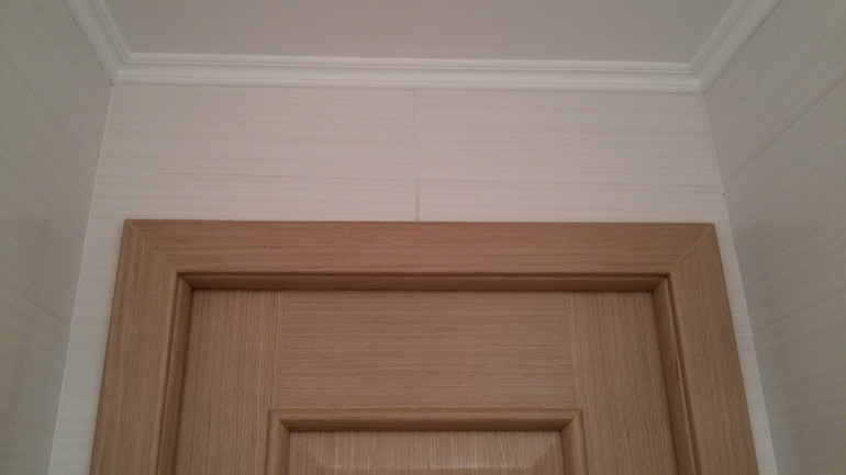 Обои под покраску, не очень довольна. краска Dulux Vinil Trade Matt, заявлена как моющаяся. Но по факту если потереть тряпочкой, потом заметно немного. Потолок думали делать натяжной, т.к. очень кривые потолки и стык плит ужасен с перепадом около 5см. Но после сокращения мужа на работе, финансы совсем нас покинули и пришлось что-то придумывать, т.к. жить с серым потолком уже не было сил. В итоге поклеили те же обои что и на стенах и покрасили их белой краской (точнее еще нужно покрасить в один слой, руки не доходят((( ). На месте стыка плит муж сделал конструкцию из гипсокартона и дополнительное освещение коридора.