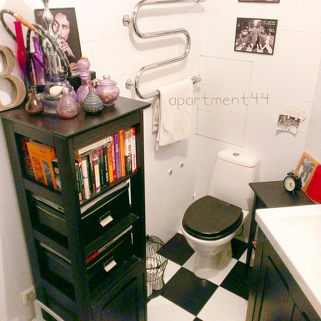 По замыслу, должна была быть напольная плитка с газетным принтом, но она была дорогая, а бюджет трещал по швам. Так что, придумала тогда и нашла штору для ванны с чертежами и формулами "а-ля-Леонардо да Винчи", но в наличии ее нигде не оказалось. Поэтому, висит обычная черно-белая штора из Икеа. И экран под ванну, тоже ждет своей очереди. Ремонт - состояние перманентное. Да, и ванна справа от входа.