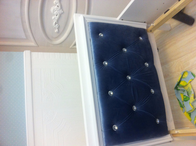 На фанеру прилеила поролон , отверстия сделала заранее прочертив, потом просто бархат положила и пуговицами затягивала в отверстия с изнаночной стороны фанеры закрепляла шнурок степлером мебельным, потом к кровати на жидкие гвозди, обрамление в завершении