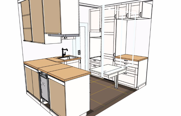 Можно было сделать по двум сторонам кухню, как сейчас там, без заворота на стену к двери. С одной стороны там сейчас плита, стиралка и мойка с мусором, а с другой — холодильник и два шкафчика, на одном микра стоит, на другом чайник и чашки/кружки. Итого получается около 65 см рабочей поверхности плюс кочующий громадный стол, за которым все равно не посидеть норм: постоянно кто-то чай ходит делать и все просят подвинуться.