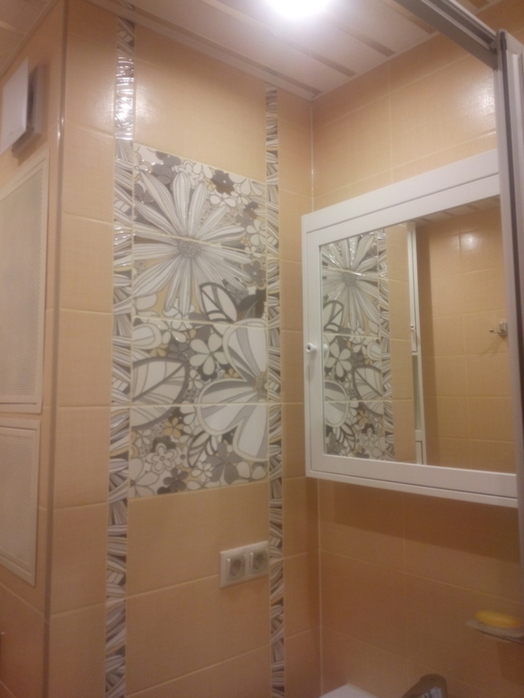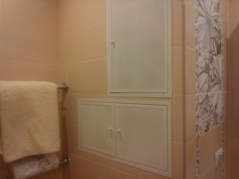 В коробе стояка строитель внезапно предложил сделать доп.нишу, на которую срочно пришлось искать дверку. Остановились на металлической дверце с перфорацией. Когда выбирали цвет, казалось, что он очень близок к цвету плитки, но в реальности оказался намного светлее.