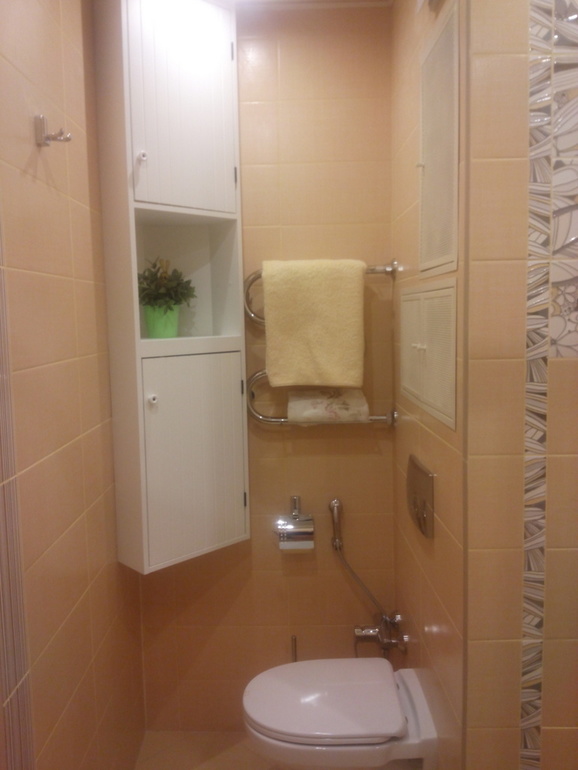 Икеевский шкаф Сильверон в напольном положении не влез, т.к. оказывался впритык к унитазу. Поэтому в итоге был повешен под потолком. До верхней полки без табурета не достать, зато нижняя очень удобно расположена