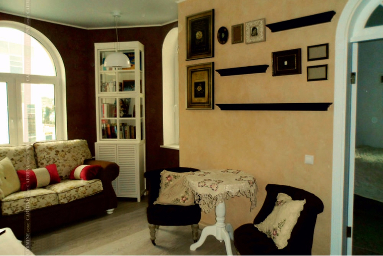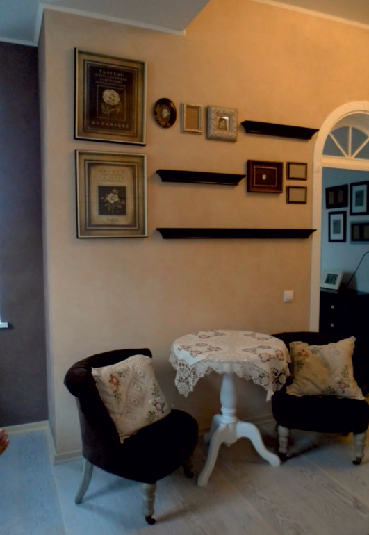 Из однокомнатной квартиры, была сделана двухкомнатная, при этом осталось, много пространства и света. Квартира выполнена в среднем стиле между провансом и гранжем. Использовано пять видов декоративной штукатурки и много дизайнерских аксессуаров, сделанных автором.
