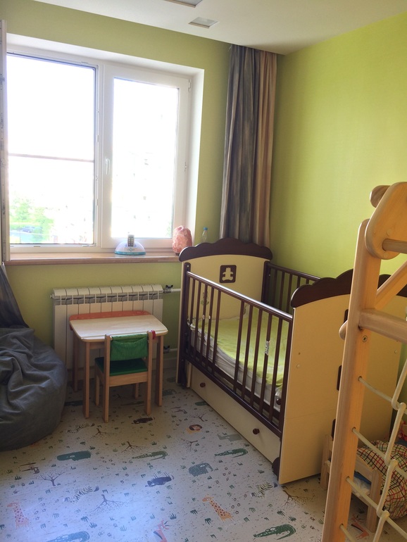 У нас дочке 2,2 скоро будет вторая, о чем мы не знали и не планировали делая ремонт, возможно отдали бы им бОльшую комнату. Тут всего 9кв м. Сразу скажу, все вещи хранятся в гардеробной, тк у нас всего один шкаф и гардеробная.