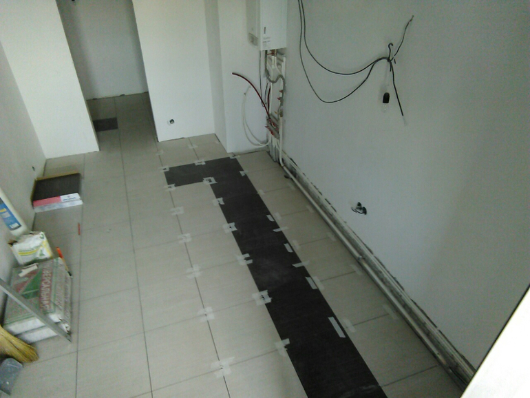 Глупо бы было всю квартиру в плитку укладывать))Коричневая плитка уложена по периметру кухни,а в коридоре относительно освещения которого пока нет.