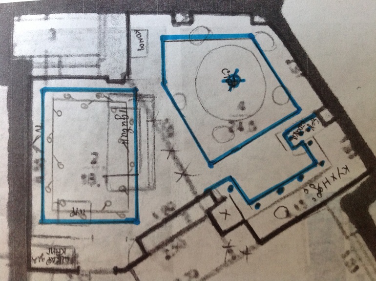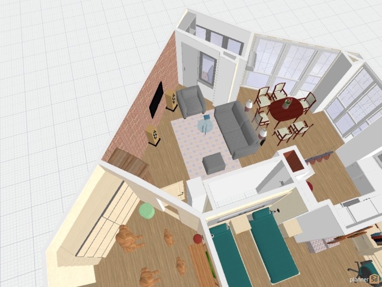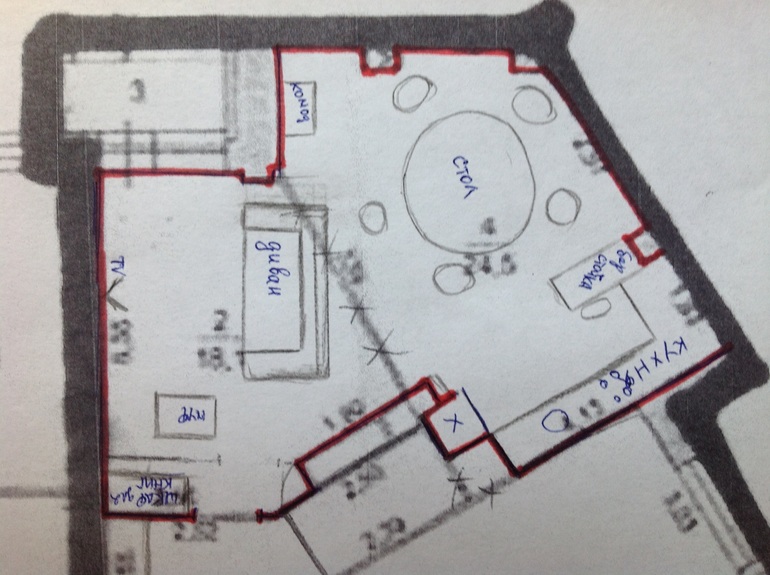 Есть сложное многоугольное помещение кухни-гостинной.Прилагаю план и планируемый расстановку мебели.